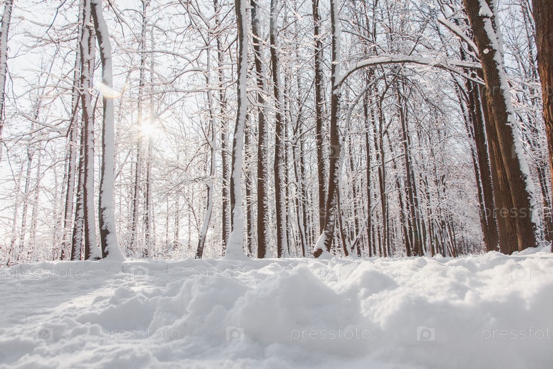 Закат солнца зимой мягкий со снегом на деревьях