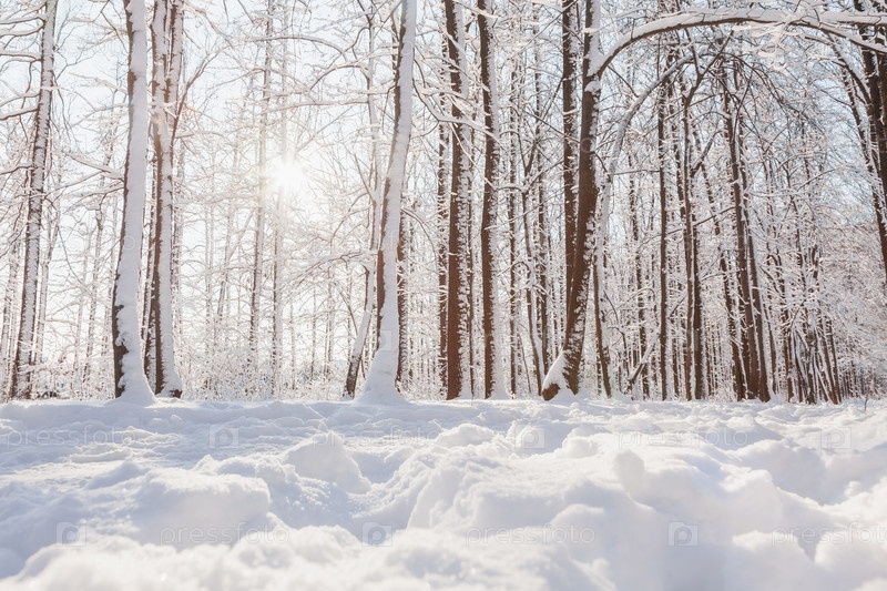 Закат солнца в зимнем сосновом лесу с снегом на деревьях и полу в солнечный день