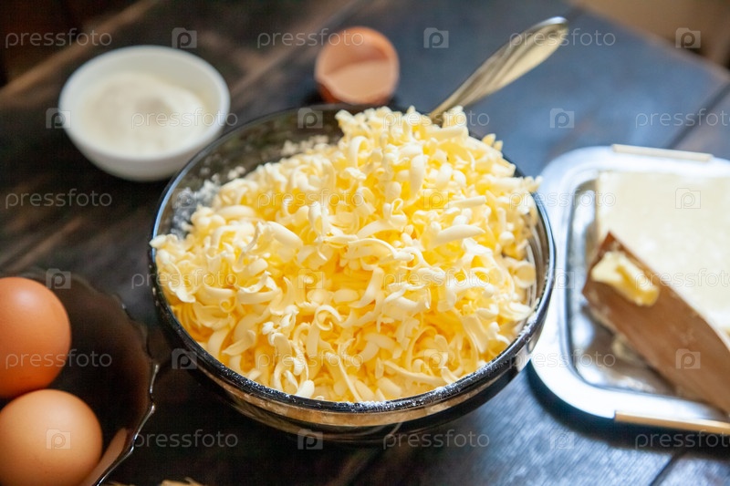Ингредиенты для выпечки короткого хлеба: масло, яйца, сметана на деревянном столе