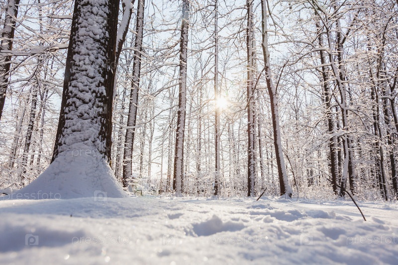 Закат солнца в зимнем сосновом лесу с снегом на деревьях и полу в солнечный день
