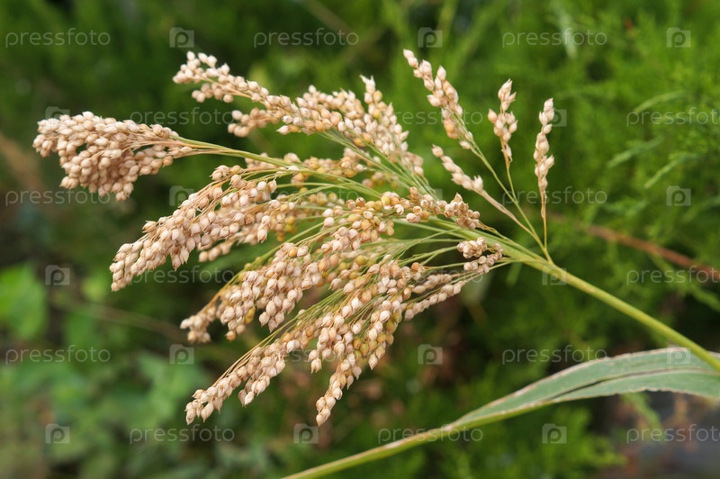 Просо (Panicum miliaceum) колос с зернами на природном фоне