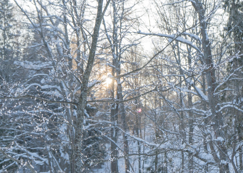 Зимние лесные пейзажи со светящимся солнцем сквозь деревья