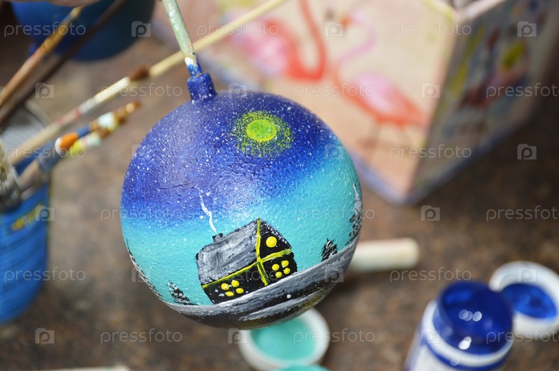 Женские руки тщательно рисуют рождественский шар в ярко-синих оттенках: силуэт деревенского дома прикреплен к его поверхности, создавая зимний пейзаж