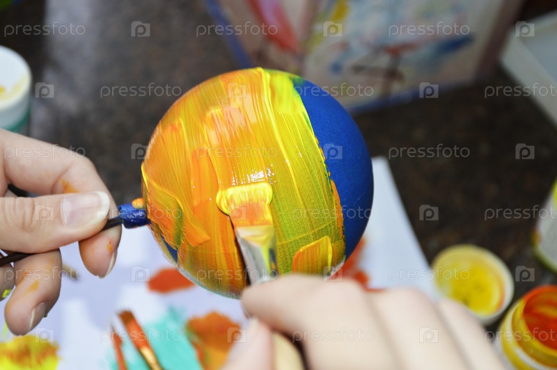 Женские руки тщательно рисуют ярко окрашенный рождественский шар: расчесывают полоски краски на его поверхности - основа для рисунка