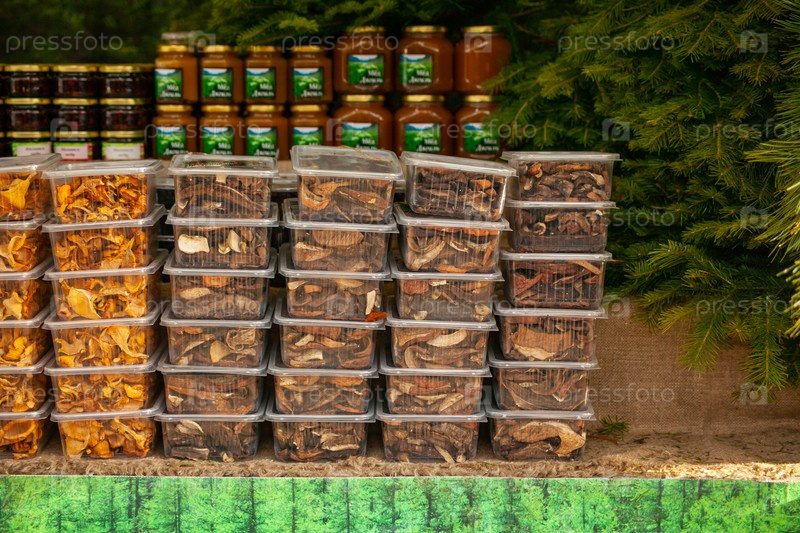 Сушеные грибы в пластиковых контейнерах на Рождественской сельской ярмарке