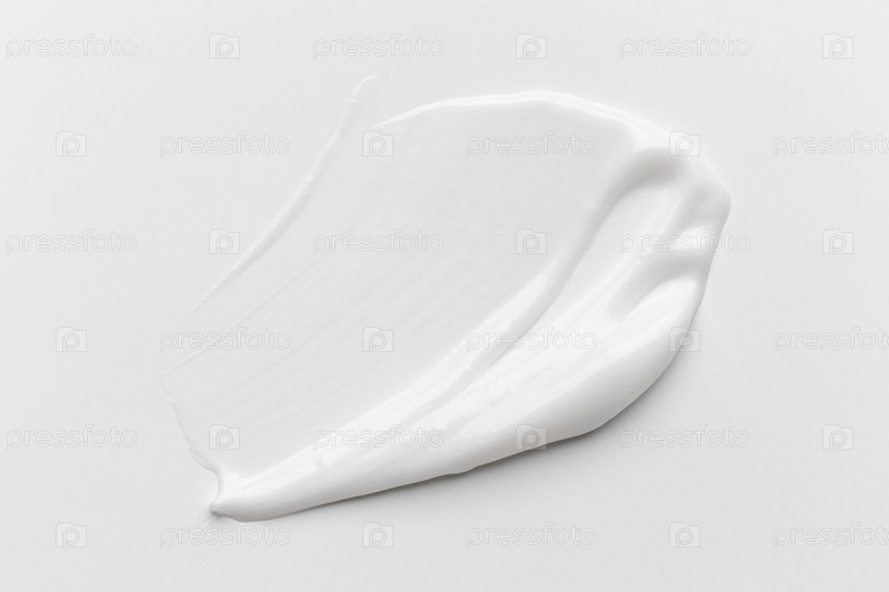 Косметический продукт, размазанный над белым кремом для увлажнения, изолирован на белой, сжатой и смазанной области крема по уходу за кожей, тестируемого в исследовании