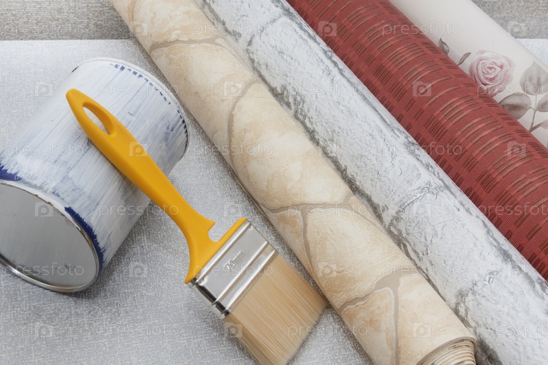Многоцветные обои, банка краски и кисть на фактурном фоне. Текстовое пространство. Концепция ремонта дома или квартиры. Вид сверху