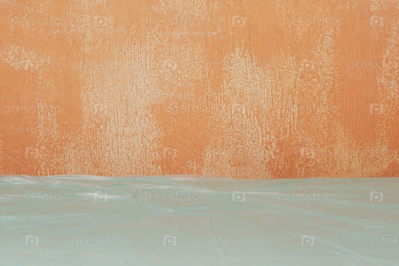 Текстурированная серая стена и стол, покрытые пленкой. Декорации для ремонта. Старые стены и столы с пленкой в качестве фона