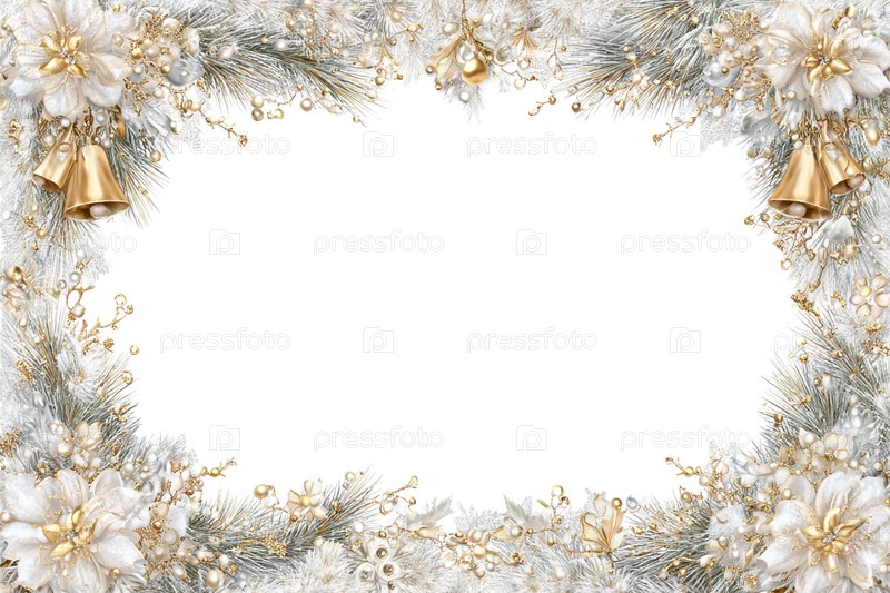 Рамка. Christmas winter frame with silver fir branches, golden bells, and white flowers