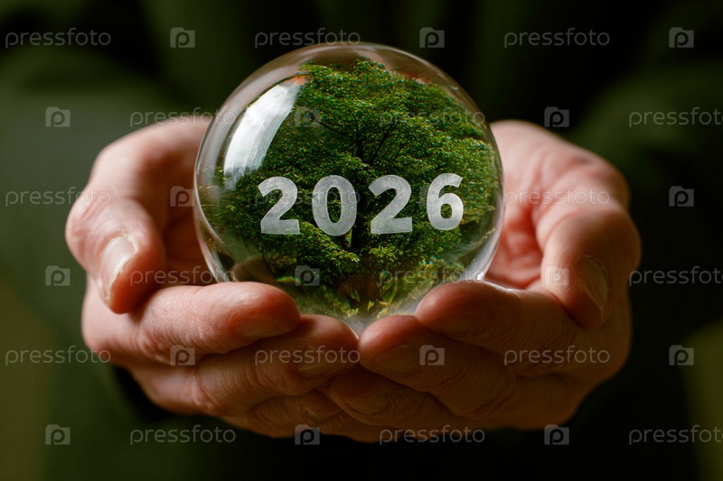 Руки, держащие стеклянный шар с изображением 2026 года и зеленого дерева внутри.Символ будущего и экологического сознания