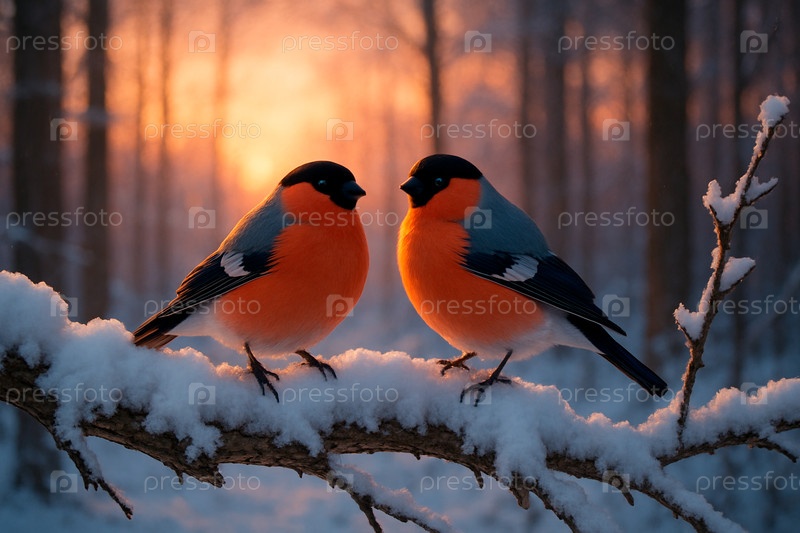 Снегири на ветке в лесу. Two vibrant bullfinches sit on snow-covered branch in winter forest at sunset. Postcard for winter holidays