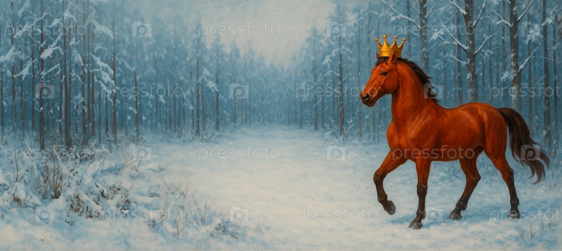 Величественный красный конь в золотой короне идет по снежному лесу