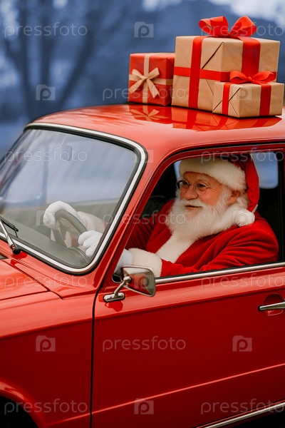 Санта едет на классической красной машине через заснеженный лес, неся сумку с цветными рождественскими подарками