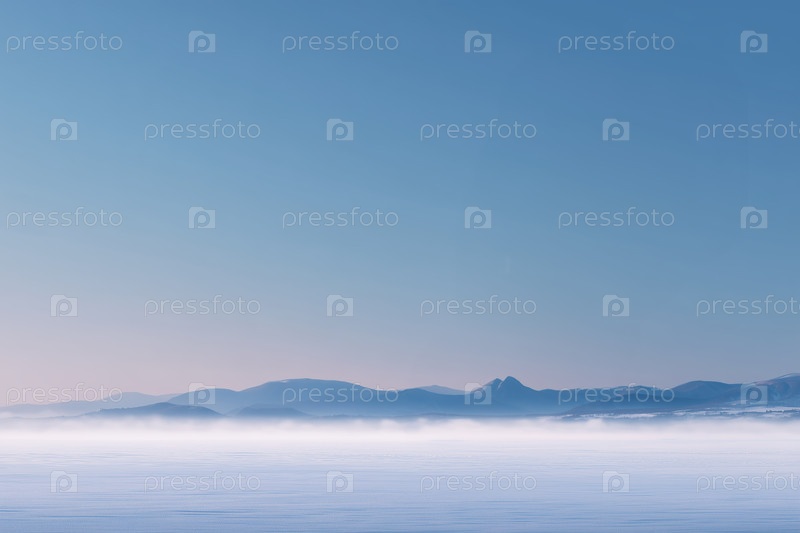 Прекрасный пейзаж замерзшей равнины тумана и гор утром