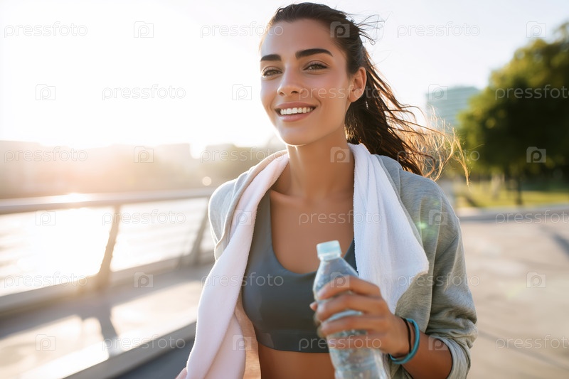 Изображение красивой молодой фитнес-женщины на открытом воздухе пьет воду, чтобы расслабиться