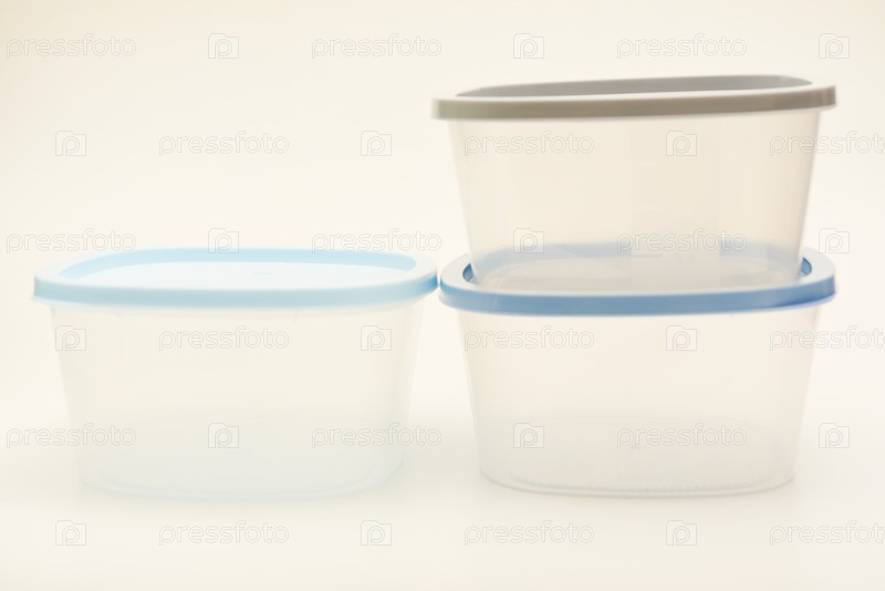 Большие контейнеры с голубой крышкой для пищи на белом фоне