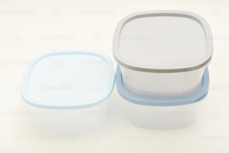 Большие контейнеры с голубой крышкой для пищи на белом фоне