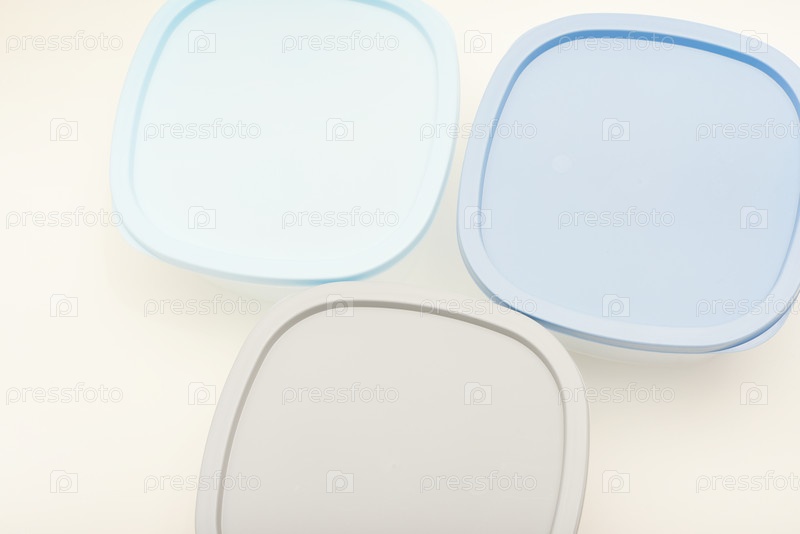 Большие контейнеры с голубой крышкой для пищи на белом фоне