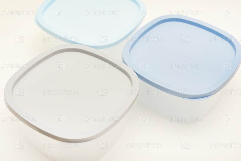 Большие контейнеры с голубой крышкой для пищи на белом фоне