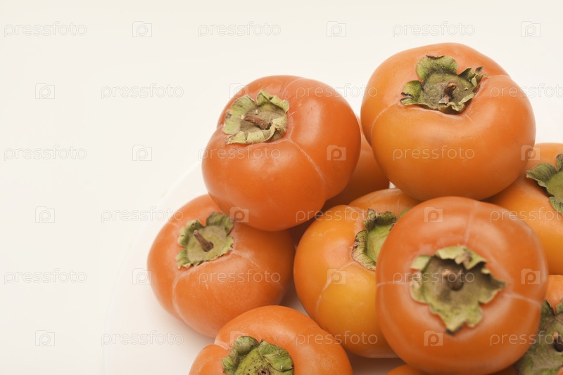 Оранжевый плод персимона, созревший персимон на светлом фоне