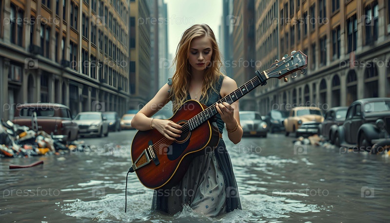 Молодая женщина играет на гитаре, генерируя AI
