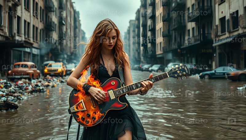 Молодая женщина играет на гитаре, генерируя AI
