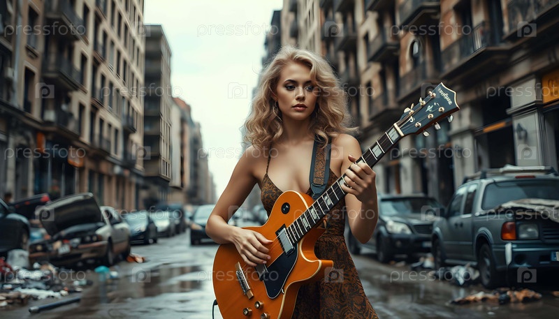 Молодая женщина играет на гитаре, генерируя AI
