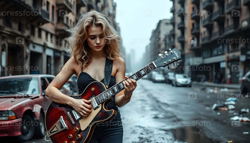 Молодая женщина играет на гитаре, генерируя AI