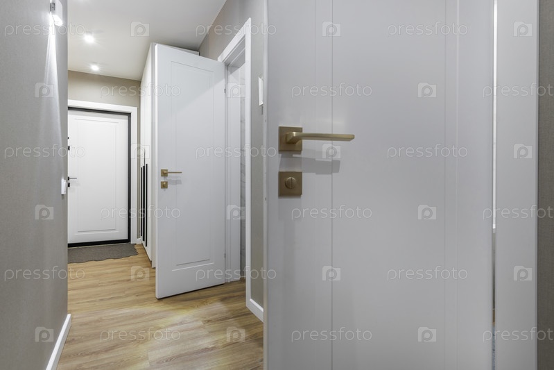 Современный коридор в квартире с белыми дверями и деревянным полом
