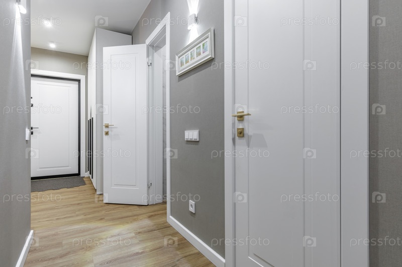 Современный коридор в квартире с белыми дверями и деревянным полом