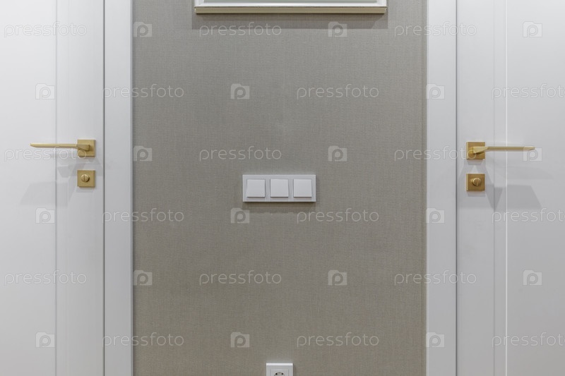Современная белая дверь с золотой ручкой в интерьере ванной