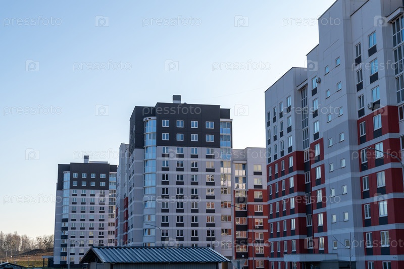 Современные многоэтажные жилые здания с фасадами серого, белого и красного цветов