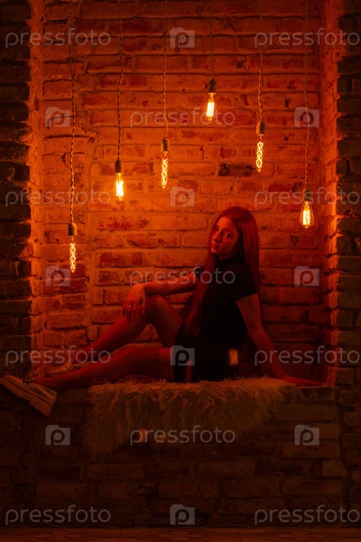 Молодая женщина с рыжими волосами позирует при слабом промышленном освещении, сидя в нише кирпичной стены, где висят старинные лампочки Эдисона, создавая теплое атмосферное свечение