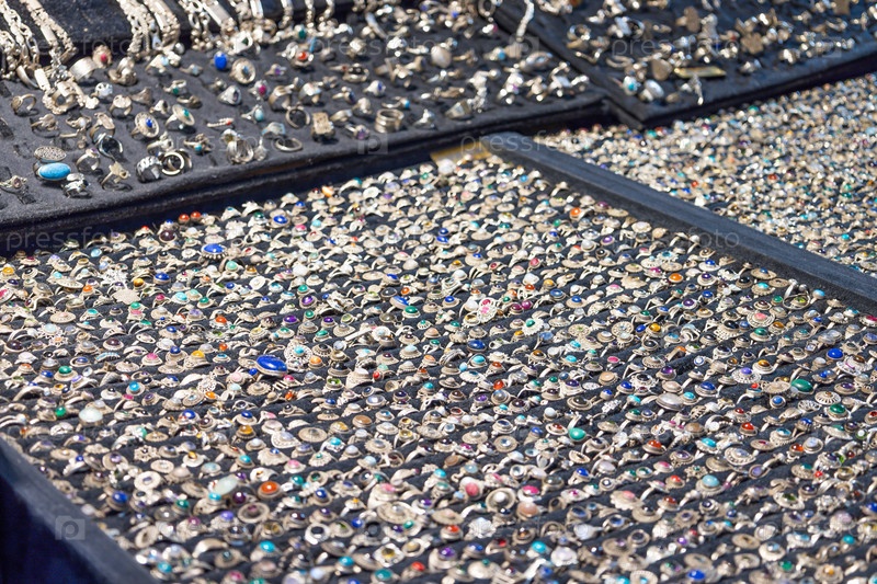 Вид сверху на тысячи серебряных колец с драгоценными камнями, разложенные на подносах на прилавке рынка, создавая фактурный фон изобилия