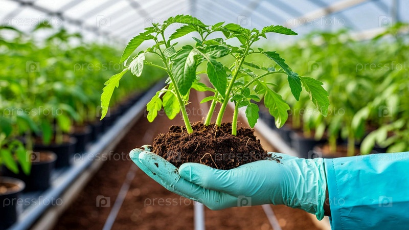 Саженцы томатов с почвой в руке крупный план, на фоне теплицы