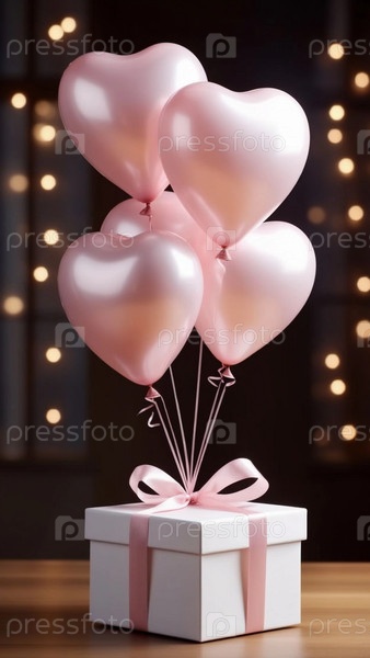 Подарок с розовыми шариками сердца на темном фоне со свечами