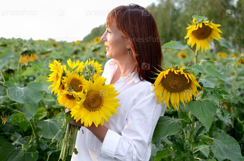 Женщина в сером платье держит яркий букет подсолнечников на солнечном поле среди лучей заходящего солнца