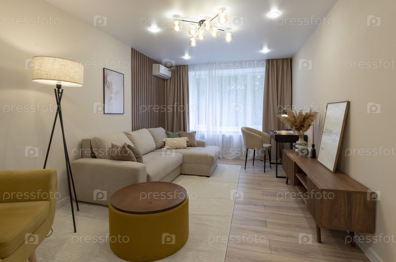 Гостиная с столом в современной квартире