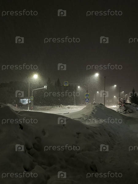 Сильный снегопад покрывает дорогу и уличные фонари во время темной зимней ночи в тихом городе
