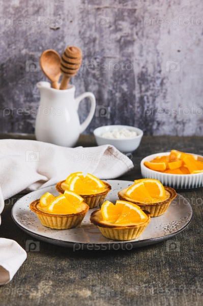 Мини выпеченные пироги с творогом и апельсином на тарелке на столе вертикальный вид
