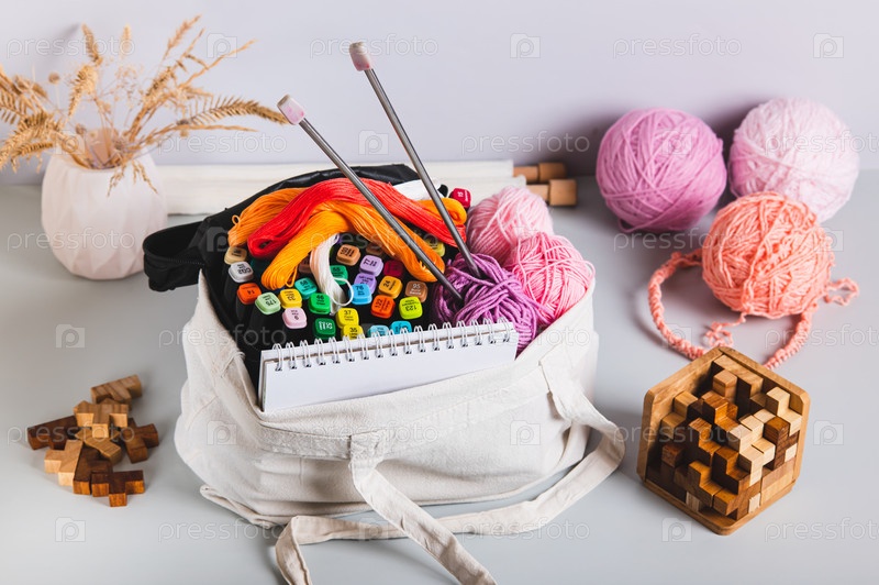 На столе лежит сумка с аксессуарами для вязания и отдыха