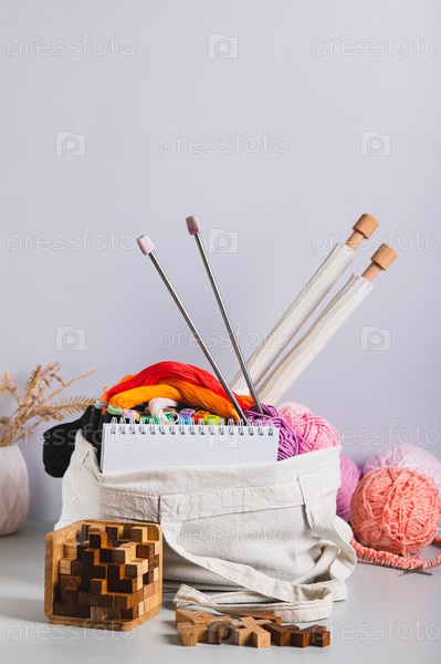 На столе лежит сумка с аксессуарами для вязания и отдыха