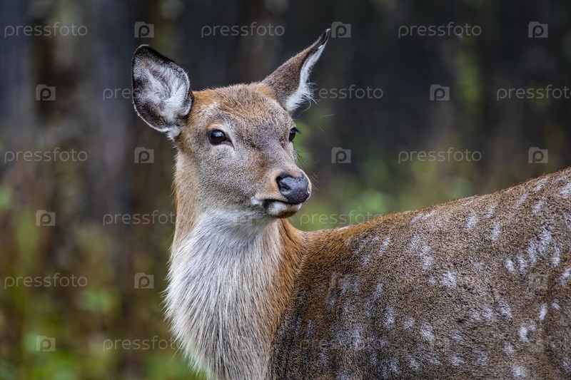 Виденный олень (Cervus nippon) в зарослях леса, ближайший снимок