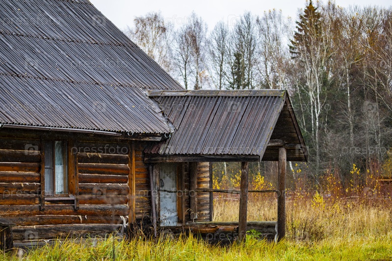 Деревянная хижина с крыльцом на краю осеннего леса
