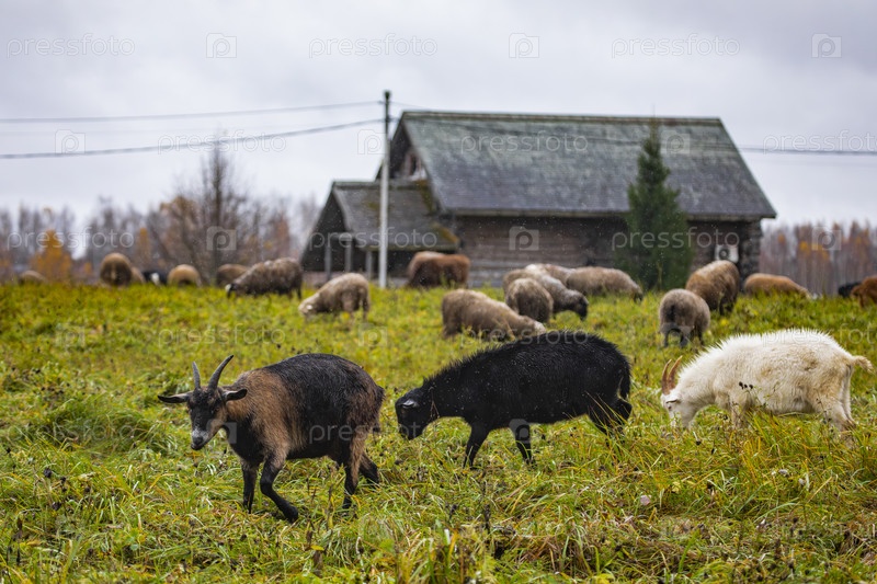 Стадо овец и коз на пастбище возле деревянного дома