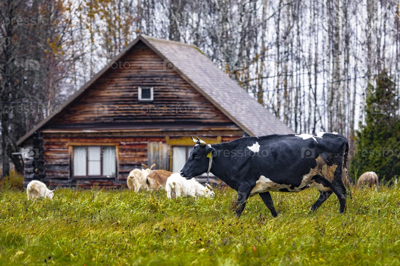 Черные и красочные коровы и козы на пастбище возле деревенского дома осенью