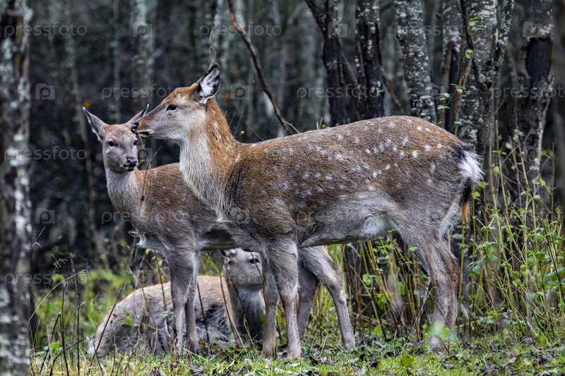 Пятнистый олень (Cervus nippon) в зарослях леса, несколько особей