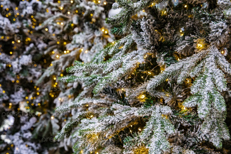 Снежные ветви новогодней ночи с огнями гирлянд