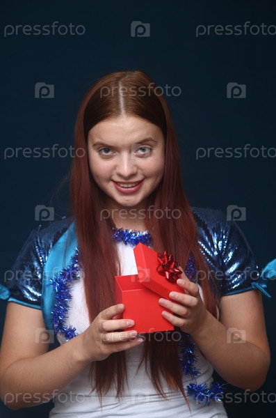 Красивая девушка позирует с подарком и новогодним украшением