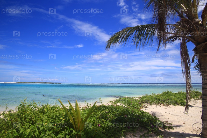 Пляж, пальмы, песчаный берег и голубое небо на курорте в океане